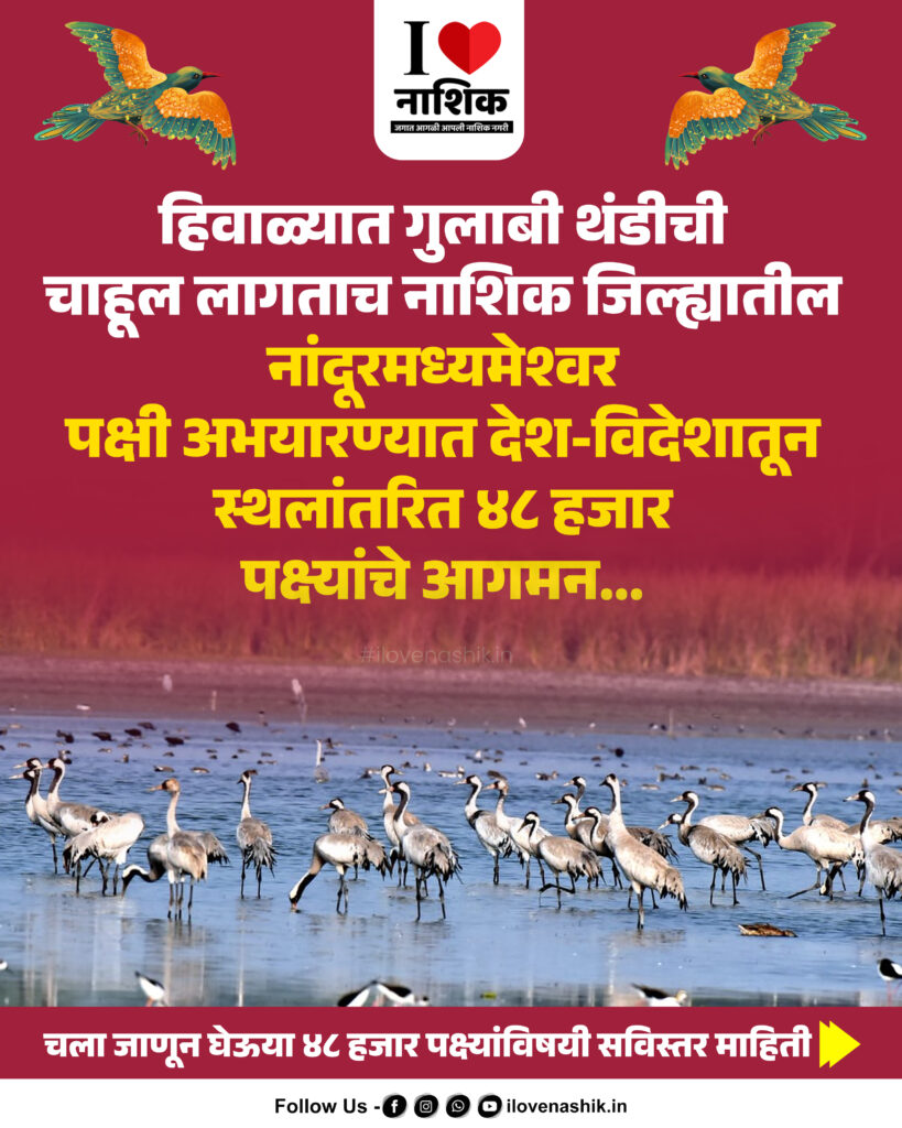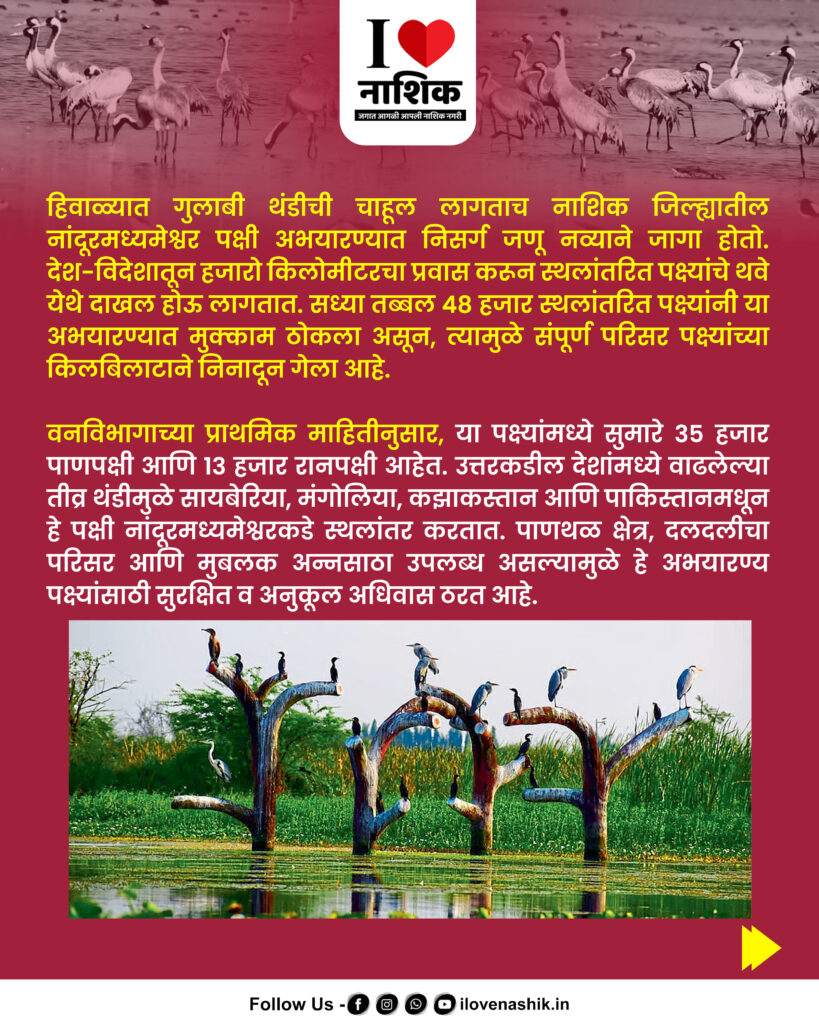 नांदूरमध्यमेश्वर : हिवाळ्याची चाहूल लागताच नांदूरमध्यमेश्वर पक्षी अभयारण्यात देश-विदेशातून स्थलांतरित पक्ष्यांचे आगमन मोठ्या प्रमाणात सुरू झाले आहे. रामसर स्थळाचा दर्जा लाभलेल्या या अभयारण्यात सध्या सुमारे ४८ हजार पक्ष्यांनी मुक्काम ठोकल्याने संपूर्ण परिसर पक्ष्यांच्या किलबिलाटाने निनादून गेला आहे.